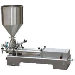工作原理:該機為氣動柱塞式定量灌裝,由氣缸驅動的活塞將料斗內的物料通過三通轉閥抽進料管,再由氣缸驅動將物料經由三通轉閥推出,物料從灌裝嘴進入容器;通過氣缸推進的行程控制灌裝量的多少。