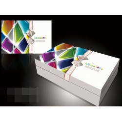 材質及工藝:盒蓋為高檔裝幀藝術紙四色印刷,裱糊工業版,盒底也為高檔裝幀藝術紙,裱糊工業版,配絲帶及蝴蝶結。