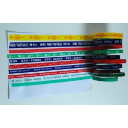 產品特性:該產品粘性好,環保、高粘、耐用、強韌。適合超市扎口機上膠帶使用,也可用于顏色標識,符合環保要求,遇有水不脫膠,是國內捆扎蔬菜的選