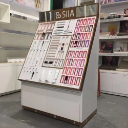 選用木制材料來制作的高端化妝品展示柜,可以選用天然實木,經過高溫殺蟲、脫脂、干燥處理,實木含水量較低,經過刨光去掉表面裂痕,蟲孔等不良品,所有重要接縫處用三角木加固,使得整個木架結構更加合理、牢固。