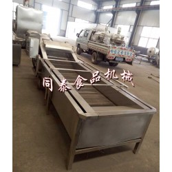 .本清洗機采用汽泡水浴清洗,適用于葉類蔬菜的清洗,可根據產品的質量要求來定做。設備除電機等標準件外均采用不銹鋼材料制作,完全符合出口食品衛生要求。設備中設有氣泡發生裝置,使物料呈翻滾狀態,去除產品表面農殘功效,同時可加入適量的藥劑,進行毒固色,漂浮物可以從溢流槽溢出,沉淀物從排污口排出,以達到清洗的目的。