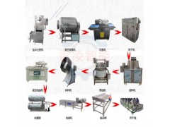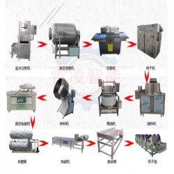 油炸牛肉干加工設備流程:解凍池→鹽水注射機→滾揉機→切條機(鮮肉)→烘干房→油炸機→甩油機→拌料機→真空包裝機→殺菌鍋→清洗機→風干機→成品