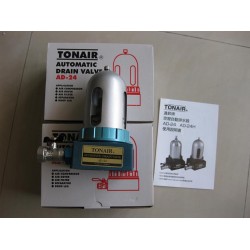 TONAIR AD-24 AD-24H 空壓自動排水器。它是利用空壓系統本身的空氣壓力,經由一條導管連接,其頂端的泄壓閥可調整微量排氣,使排水器之壓力低于空壓系統,可將冷凝水、油泥與銹渣推擠遠離空壓系統。這些水份與雜質被連續擠壓后,輸入積存在自動排水器的下方,再由浮球升高來打開上方的控制器之閥門,再定量自動排放與關閉,此種裝置可有效的保持空壓系統潔凈,而且安裝時可不受高度與距離的限制,可隨意安裝在理想位置,它更不需要使用電源或其它控制導管即可靈活而精準的排放水份與污垢。