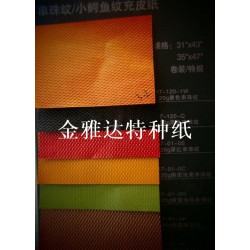 此產(chǎn)品為串珠紋環(huán)保充皮紙,可以給您的產(chǎn)品添加高貴感。我公司產(chǎn)品花色品種眾多。可生產(chǎn)“K&A”牌環(huán)保充皮紙600多個(gè)不同紋理及顏色產(chǎn)品,并以其獨(dú)特的內(nèi)在品質(zhì)和賞心悅目的視覺品位受到客戶歡迎,可以完全替代進(jìn)口同類產(chǎn)品,被廣泛用于出版、印刷、包裝及證照制作等行業(yè),是精裝書刊、集郵冊、帳薄、日記本、首飾盒、珠寶盒、高檔酒盒、高檔畫冊、證照以及各類紙制品、裝飾盒等封面制作的理想材料,表面可燙印各種電化鋁和粉泊,使用性能穩(wěn)定。