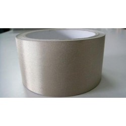 導電布 - 構造導電布材料是在聚酯纖維上,先電鍍上金屬鎳,在鎳上再鍍上高導電性的銅層,在銅層上再電鍍上防氧化機防腐蝕的鎳金屬,銅和鎳結合提供了極佳的導電性和良好的電磁屏蔽效果,屏蔽范圍在100K-3GHz。