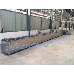 LSAP-D11/6/3600超聲波清洗機,該設備由超聲波發生器(超聲波電源)和超聲波清洗槽、超聲波振盒(粘接超聲波換能器)、噴淋裝置、風刀裝置、烘干隧道、防銹槽等多部分組成。超聲波發生器將工頻電能轉變成25KHz的高頻電信號,通過高頻電纜輸送到超聲波換能器上,換能器被加上高頻電壓后,產生強有力的超聲振動,在液體中迅速傳播,作用于超聲波清洗槽內液體介質中,產生每秒2.5萬次的振動,從而將工件上附著的污垢震落,達到清洗目的,通過鏈條傳送至噴淋、漂洗、風刀、烘干、防銹等一系列環節,從而達到自動化全處理過程。