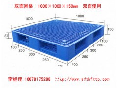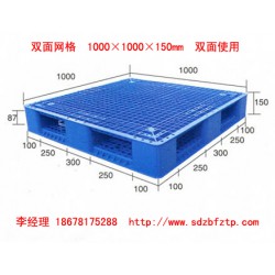 二、雙面塑料托盤:雙面塑料托盤正反兩面均可使用,分為雙面平面和雙面網(wǎng)格兩種,主要規(guī)格有1500×1300×150mm 1400×1200×150mm 1300×1100×150mm 1200×1000×150mm 1100×1100×150mm 1000×1000×150mm 等。雙面使用,四向進(jìn)叉,主要適合于機(jī)械叉車,動(dòng)載一般在1噸--2噸 靜載:4-6噸