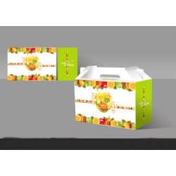 材質及工藝:手提水果包裝盒是由300g白卡四色印刷、覆啞膜,裱300g灰底白板。