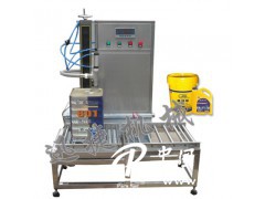 本機由稱重傳感器、電腦控制系統、灌裝系統、封口機構、機架、滾道等組成,操作流程:人工移上桶;手動啟動;自動開啟輸料泵及大小給料閥門;到設定工作點1自動關快給料閥門;到設定工作點2自動停輸料泵并關慢給料閥門;人工加蓋移桶至壓蓋位置;腳踏開關控制壓蓋,壓蓋結束人工移桶;入庫。