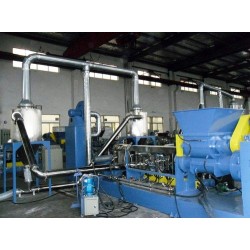 2.造粒:目前市場(chǎng)主流的工藝流程為:1.密煉機(jī)(使配好的原料混合分散好)---2.提升機(jī)(將密煉機(jī)煉好的料提升到喂料機(jī))----3.錐雙強(qiáng)制喂料(密煉機(jī)煉好為面團(tuán)狀,用錐雙喂料機(jī)強(qiáng)制喂進(jìn)單螺桿擠出機(jī))-----4.單螺桿主機(jī)(將料壓縮擠出)-----5.風(fēng)冷熱切機(jī)頭(將單螺桿擠出的料切成顆粒狀) 6.旋風(fēng)分離器(使料粒分散冷卻)-----7.振動(dòng)篩(篩除過細(xì)及過大的顆粒)-----8.料倉(裝成品)