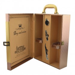 材料;PU皮裱3mm密度板, 工藝,燙金,金屬扣 作用:裝兩支紅酒瓶