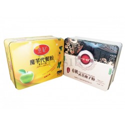 魔芋代餐粉鐵盒的外包裝選用單面四色印刷工藝,外過啞油、內過透明油。啞油具有啞光效果,能使鐵盒整體具有紙張質感,低調而不失大氣。而透明油能令到鐵盒表面的光澤度和透明度得到提升,讓消費者在視覺上更為**、大氣。