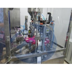 塑料軟管灌裝封尾機利用分度機構帶動裝有夾具的轉盤作間歇運動,完成自動灌裝及軟管加熱、封尾、壓碼、切邊等一系列功能。
