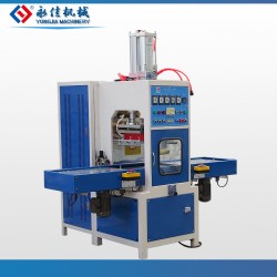 通過人工放料,高周波自動(dòng)熔斷,切斷,定型的自動(dòng)機(jī)械。工作時(shí)通過人工放料,放入工模位置上,按起動(dòng)開關(guān),底部工?;遄詣?dòng)滑動(dòng)到固定工作位置。機(jī)頭氣缸驅(qū)動(dòng)工模下降,通過延時(shí)預(yù)熱,高周熔接,切斷,定型,定型完畢機(jī)頭上升,底部工?;遄詣?dòng)滑出,手工取出成品。在生產(chǎn)中可自由設(shè)置各部時(shí)間,一般為3--10秒一個(gè)作業(yè)過程。