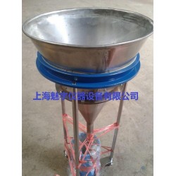 稱量不帶延伸套筒的容重桶,精確至0.1克,在容重桶上裝上套筒,并將其放在儀器的錐形漏斗下,將試樣以100克為一份倒入漏斗中,用毛刷攪動試樣,使其通過篩網落入容重桶中。當裝有延伸套簡的容重桶填滿時,在避免振動的情況下移去套筒,用直尺刮平表面,除去多余物料,直至表面與容重桶上緣位于同一水平面上為止。