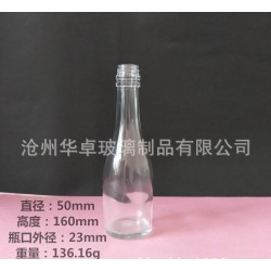 這款酒瓶容量為120ml,是為北京二鍋頭總廠開模生產的,是用于盛裝“一擔糧”的白酒,這種白酒已經在市場上已流通。白酒玻璃瓶瓶細而高,外表美觀,質量是執行鈉鈣玻璃藥瓶標準,所以也可用于*酒、藥酒的盛裝。