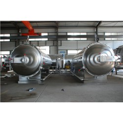 殺菌鍋包括鍋身、鍋蓋、彎臂裝置、安全連鎖裝置、軌道、密封圈、蒸汽、噴管、冷卻水管、管道、保壓裝置及閘閥等。氣墊密封式殺菌鍋的密封裝置采用國內(nèi)先進(jìn)技術(shù)配置,整機設(shè)計合理,運行安全可靠,結(jié)構(gòu)緊湊,具有操作容易,維修方便、安裝簡單等特點。保壓采用自動控制裝置,當(dāng)壓力超限時可以自動進(jìn)行調(diào)節(jié),以*保*容器在允許范圍內(nèi)正常工作。