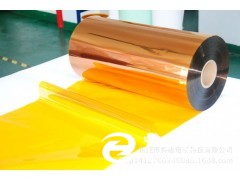 聚酰亞胺薄膜(Polyimide Film)是世界上性能*好的薄膜類絕緣材料,由均苯四甲酸二酐(PMDA)和二胺基二苯醚(DDE)在強極性溶劑中經縮聚并流延成膜再經亞胺化而成。聚酰亞胺薄膜具有優良的耐高低溫性、電氣絕緣性、粘結性、耐輻射性、耐介質性,能在-269℃~280℃的溫度范圍內長期使用,短時可達到400℃的高溫。