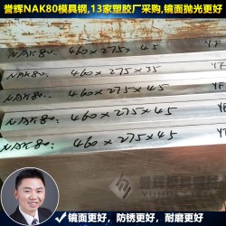 4)譽輝電渣NAK80模具鋼。產品特點是:純凈度高,模具不容易生銹。硬度均勻,耐磨性好,模具壽命長。鏡面拋光性能好。鉆孔攻牙CNC電腦鑼加工時走刀順暢。銷售價格高相對較高,很多人卻被“低價”迷惑雙眼。