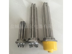 概述及工作原理:六角螺紋絲扣加熱管(也稱插入式電加熱器):是采用U型管狀電熱元件,依據加熱不同介質設計規范,按照功率配置要求裝配在螺紋絲扣蓋上,插入需加熱物料中,發熱元件工作時所發出的大量熱量傳導給被加熱介質使介質溫度升高,達到所需的工藝要求。當介質溫度達到工藝要求的設定值時,控制系統根據溫度傳感器信號,經PID運算后調節電加熱器輸出功率,對發熱元件的電阻性負載實現溫度控制。使介質溫度均勻,達到所需要求;當發熱元件超溫或低液位時,發熱元件的聯鎖保護裝置立即切斷加熱電源避免發熱元件燒壞,延長使用壽命。