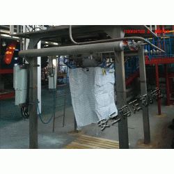 將噸包裝袋套在加料嘴上,將包裝袋四角掛在氣缸上,按動“啟動”按鈕,這時夾袋氣缸開始工作并夾住袋口,氣缸將包裝袋四角撐開,控制器將包裝袋重量自動去除,系統驅動喂料器打開,物料自動下落,以很快的速度達到目標值, 這時夾袋袋氣缸松開袋口,氣缸將包裝袋四角松開。