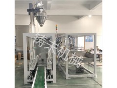 本機組由自動供袋庫→自動上袋機→夾袋升降機構→脫氣機構→立式螺旋→抱袋機構→導入機構→立袋輸送機,除塵系統及控制系統組成。1取袋機構利用真空吸盤從袋庫取袋→2自動理袋、輸送→3自動開袋→4上袋機械手自動上袋→5夾袋器自動夾袋、開袋→6夾袋器自動升降填充→7自動脫氣(排出物料之間的氣體)→8顛袋震動→9自動抱袋→10自動導入→11自動縫包,整個流程伴隨正壓、負壓檢測系統,整個過程由PLC、光電開關智能控制,檢測報警。確保整個流程穩定,可靠,連續運行。