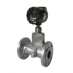 流量傳感器的流通剖面類似文丘利管的型線。在入口側安放一組螺旋型導流葉片,當流體進入流量傳感器時,導流葉片迫使流體產生劇烈的旋渦流。當流體進入擴散段時,旋渦流受到回流的作用,開始作二次旋轉,形成陀螺式的渦流進動現象。該進動頻率與流量大小成正比,不受流體物理性質和密度的影響,檢測元件測得流體二次旋轉進動頻率就能在較寬的流量范圍內獲得良好的線性度。信號經前置放大器放大、濾波、整形轉換為與流速成正比的脈沖信號,然后再與溫度、壓力等檢測信號一起被送往微處理器進行積算處理,在液晶顯示屏上顯示出測量結果(瞬時流量、累積流量及溫度、壓力數據)。