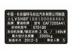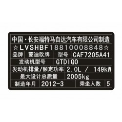 汽車出廠銘牌,這么重要的東西如果損壞了,破損了,丟失了怎么辦,可以重新補辦嗎?汽車銘牌是可以進行補辦的,需要提供行駛證、汽車登記證書、一致性證書等證件,就可以就行補辦了。在買賣二手車時一定需要確定有汽車銘牌,否則在汽車過戶時,沒有銘牌就不能辦理過戶手續(xù),如果發(fā)生損壞丟失就需要及時補辦。需要補辦的話可以聯(lián)系我們進行排版定制,原廠材質(zhì),原車尺寸,排版真實效果圖后進行確定制作,發(fā)貨快;我們制作的銘牌可以就行過戶、驗車、審車、汽車年檢等車輛業(yè)務(wù)。