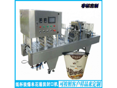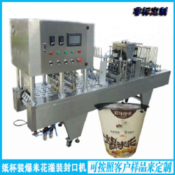 自動落杯-自動灌裝-自動熱壓封口-自動切膜-自動頂推出杯。