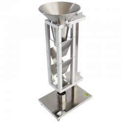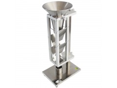 斯柯特容量計法仲鎢酸銨粉末松裝密度儀、仲鎢酸銨松裝密度計是依據GB 5060-85《金屬粉末松裝密度的測定 **部分:斯柯特容量計法》進行設計制造。該儀器適用于不能自由流過漏斗法中5.0mm孔徑漏斗及用振動漏斗法易改變特性的金屬粉末。仲鎢酸銨粉末松裝密度測試一般采用漏斗法或者斯柯特容量計法。采用斯柯特容量計法進行仲鎢酸銨粉末松裝密度測定時,先將仲鎢酸銨粉末放入上部分組合漏斗中的篩網上,自然或者靠外力流入布料箱,交替經過布料箱中的四塊傾斜角度為25°的玻璃板和方形漏斗,然后流入已知體積的圓柱杯中,呈松散狀態。然后稱量圓柱杯中的金屬粉末的質量,通過松裝密度公式進行仲鎢酸銨粉末松裝密度的計算。