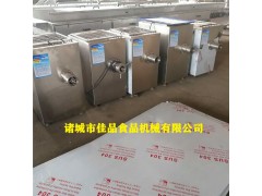 諸城佳品機械100型 凍肉絞肉機可將未解凍的肉塊或鮮肉直接進行絞切,制成規格不同的肉粒。大型絞肉機工作時利用轉動的切刀刃和孔板上孔眼刃形成的剪切作用將原料肉切碎,并在螺桿擠壓力的作用下,將原料不斷排出機外??筛鶕锪闲再|和加工要求的不同,配置相應的刀具和孔板,即可加工出不同尺寸的顆粒,以滿足下道工序的工藝要求。