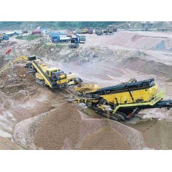 **臺履帶式破碎機,裝載的是顎式破碎機,對700-900mm大小的物料先進行粗碎,粗碎完畢后,再送入反擊式履帶破碎機進行二段破碎。經過反擊式履帶破碎機處理后,粒度在31.5以上的,經過振動篩篩分后從循環皮帶處被送回破碎機重新破碎,粒度在31.5mm以下的,送入履帶式篩分移動站,經過三層篩網的振動篩處理后,分出0-5mm、5-10mm、10-20mm、20-31.5mm四種成品物料。