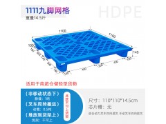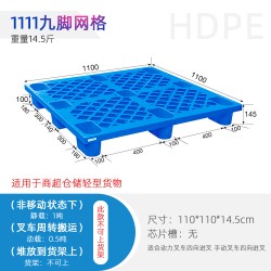 九腳托盤一般是倉庫較為輕型的貨物墊倉板和叉車周轉較輕貨物使用。九腳網格托盤,是九腳型托盤的一種,是根據塑料托盤的外形而言的,此類型的塑料托盤底部為九腳型;所以稱為九腳托盤。一般采用高密度聚乙烯(HDpe)材料注塑而成,一次注塑成型,堅固耐用,具有抗撞擊,耐酸堿,不易老化,使用壽命長等特點;此類托盤承載一般較輕,不適合于上貨架或者轉載大重量的貨物,本文介紹的1111九腳托盤是九腳網格托盤里常用的一種尺寸;