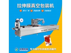 全自動連續拉伸膜真空包裝機,主要由通過下膜加熱拉伸成型,然后將包裝物填入成型好的下膜腔中,接著進入熱封真空室內對包裝物進行真空或充氣,并將上膜與下膜進行熱合,形成包裝袋,在通過橫切、縱切將包裝物進行分割,包裝的產品輸出等一次性完成,操作簡單,減少勞動力,解決招工難問題,從而提高了產品檔次,美化了生產環境,還可用于流水線生產,提高了生產效率,省時、省力、**等真正實現了自動化設備。性能特點:
