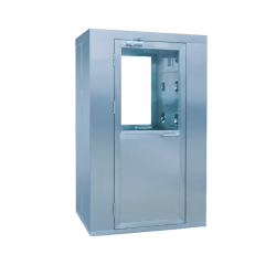 風(fēng)淋室是人/貨進(jìn)入潔凈室所的通道,為了減少由于人/貨進(jìn)出帶來的大量塵埃粒子,在潔凈室的入口處安裝功能的“氣閘室”可以減少空氣污染微粒的數(shù)量。風(fēng)淋室內(nèi)的空氣由風(fēng)機(jī)的送風(fēng)經(jīng)初效過濾器進(jìn)入靜壓箱,經(jīng)空氣過濾器過濾后,潔凈空氣以22~25m/s的風(fēng)速從風(fēng)淋室的噴嘴噴出,噴嘴角度可調(diào)節(jié),可地吹除人身或攜帶物品表面附著的塵埃,塵埃再回收進(jìn)入初效空氣過濾器,如此循環(huán)可以風(fēng)淋除塵的目的。
