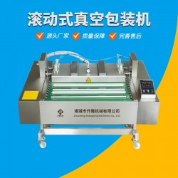滾動式真空包裝機只有1個真空室,但其真空室可以做成430毫米寬度、550毫米寬度、650毫米寬度三種規格,熱封條尺寸也較長,可以做成1000毫米、1100毫米、1200毫米三種規格,而且這三種規格的工作室尺寸,可以根據產品包裝規格和包裝種類的不同將工作室做成單一封口線和兩條封口線,這樣即可以用來包裝尺寸較大的物品,也適用于小袋大批量的包裝作業,滾動式真空包裝機可同時放入幾十個包裝袋抽真空并加熱封封口,其封口裝置采用水冷循環,封口平整牢固,設有噴淋水管,便于清洗,熱封質量通常優于單雙室真空包裝機。 滾動式真空包裝機的真空系統、熱封原理與單雙室真空包裝機相同,但滾動式真空包裝機工作蓋的打開和閉合無需人工操作,可自動開閉,因此生產效率更高。只要將盛有包裝物品的包裝袋排放在輸送帶上,便可自動完成真空包裝工作,并自動卸料到流水線傳送帶或成品收納箱內。自動抽真空封口后自動滾動出料,可以節省了人工往下拿的工序和扣蓋子的工序。