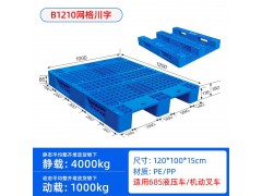 1210川字型塑料托盤是指托盤的長和寬分別為1米2和1米,是比較常用的托盤型號,1210川字型塑料托盤一般情況下指的是底部結構為川字型,面板結構為網格的塑料托盤。