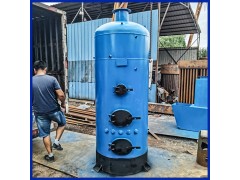 主權項目立式常壓熱水鍋爐,包括爐殼、爐襯、水冷爐頂、擋板、對流爐排和固定爐排;鍋爐外殼置于爐襯外部,形成夾層水套。