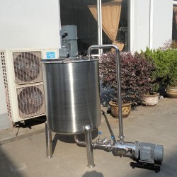 罐體、攪拌裝置和間歇式高剪切乳化機組成。慢速攪拌器是由中間的折葉槳式攪拌器與能混合高粘度的框式攪拌器組成,在框式攪拌器的周邊裝有刮壁的刮板,刮板的作用是使容器內壁與物料不斷產生新的界面而不再留有任何死角。高速均質乳化器是由高速旋轉的葉輪與具有放射狀導流槽的定子而構成,經特殊設計的葉輪上下翼葉高速旋轉,從而將物料從葉輪上下分別高壓吸入,后經葉輪以離心力高速拋射。因葉輪與定子間有較小的間隙,所以物料在被吸入與拋出過程中經過了強烈的剪切、擠壓、混合、噴射、高頻震蕩等一系列復雜的物理反應,從而將混合物料充分乳化,因慢速攪拌為同速逆向左旋不斷進行,*終使整個容器內的物料由上而下不斷循環進行混合、分散、均質、乳化。