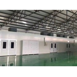 房體采用插式保溫夾心彩鋼板,密封、保溫性能好,房體裝有工作門,方便工作人員進出;鋁合金包邊大門,門裝有觀察窗,可觀察房內動態,選用低噪音,高風量風機,確保噴漆效果的性,噴漆時外部空氣經過粗效、中效過濾后由風機送到氣壓分流層,再經過頂部過濾凈化后,進入噴房內。房內空氣采用全降式,以0.2-0.3m/s的速度向下流動,使噴漆后的噴霧微粒不能在空氣中停留,而直接通過底部出風口被排出房外,加上噴房內具有一定的空氣壓力,外部灰塵無法進入噴房內,這樣不斷地循環轉換,且送入的空氣具有一定的壓力,可在工件四周形成一恒定的氣流以去除過量的油漆,從而較大限度的*證噴漆的質量。