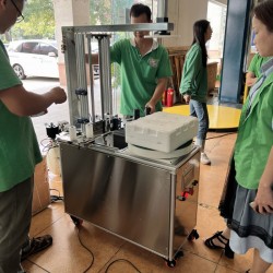 5、將機器放在平整的地面上,將薄膜系統、壓頂部分和主機架連接好,注意與周圍其他物品的間隙。