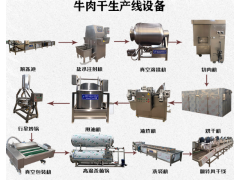 工廠專用牛肉干生產(chǎn)線設(shè)備主要有解凍機(jī)、鹽水注射機(jī)、切條機(jī)、滾揉機(jī)、油炸鍋、八角拌料機(jī)、烘干房、包裝機(jī)、巴士殺菌鍋、風(fēng)干機(jī)等。