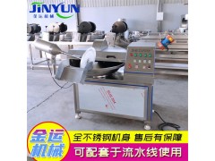 斬拌機利用站到高速旋轉的斬切作用,將肉塊,碎肉,脂肪等主要原料精細的斬切成肉餡或肉泥,同時將其他原料如水,輔料一起攪拌均勻。斬拌機的刀速、鍋速、斬刀與斬鍋的間隙達到合理的組合,從而減少物料發熱量,細度好,大大的提高了肉制品的乳化效果。